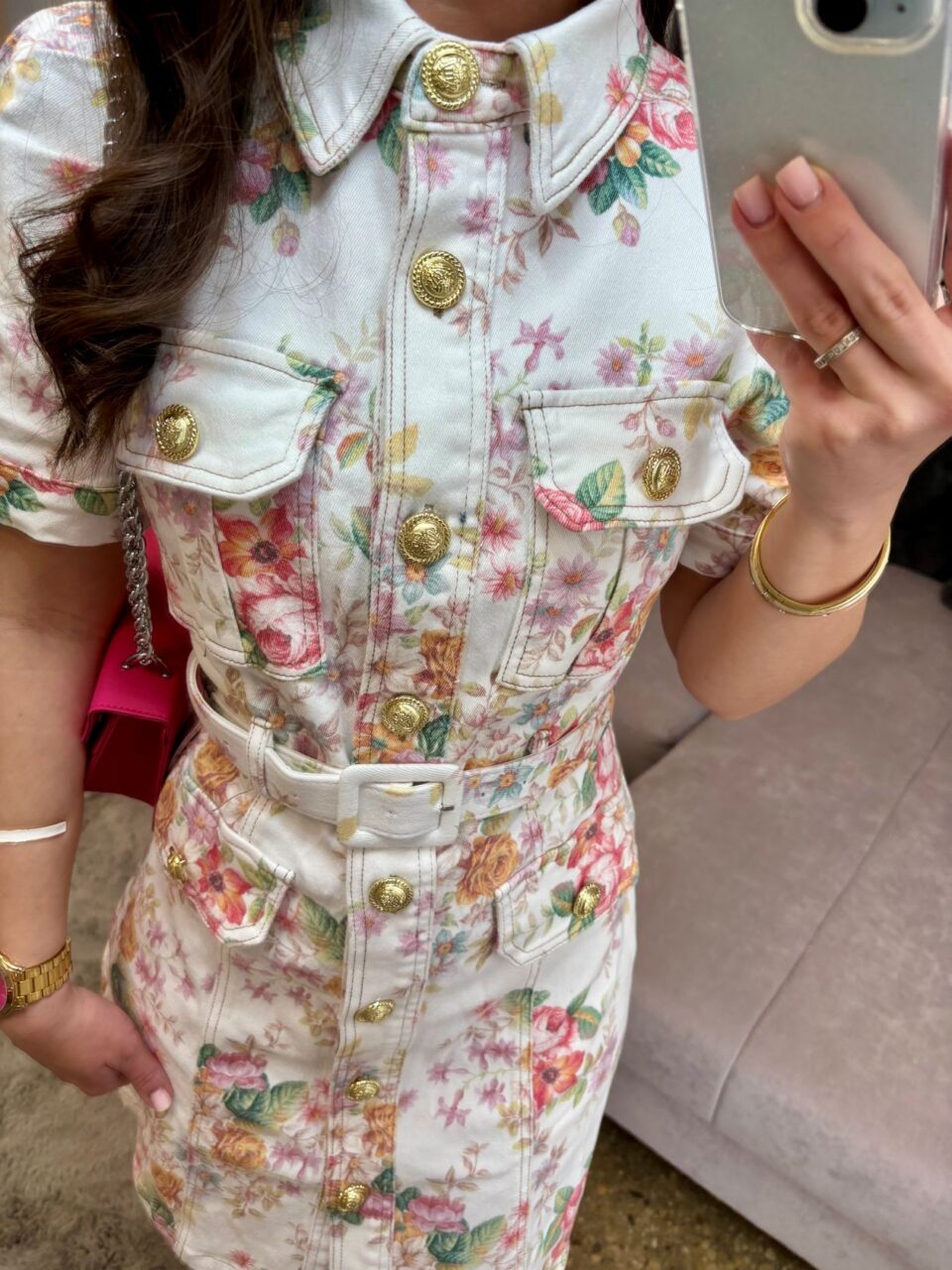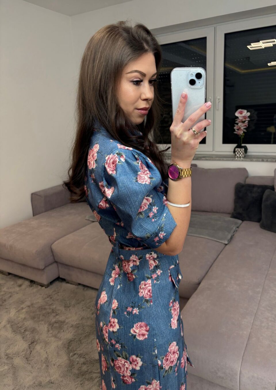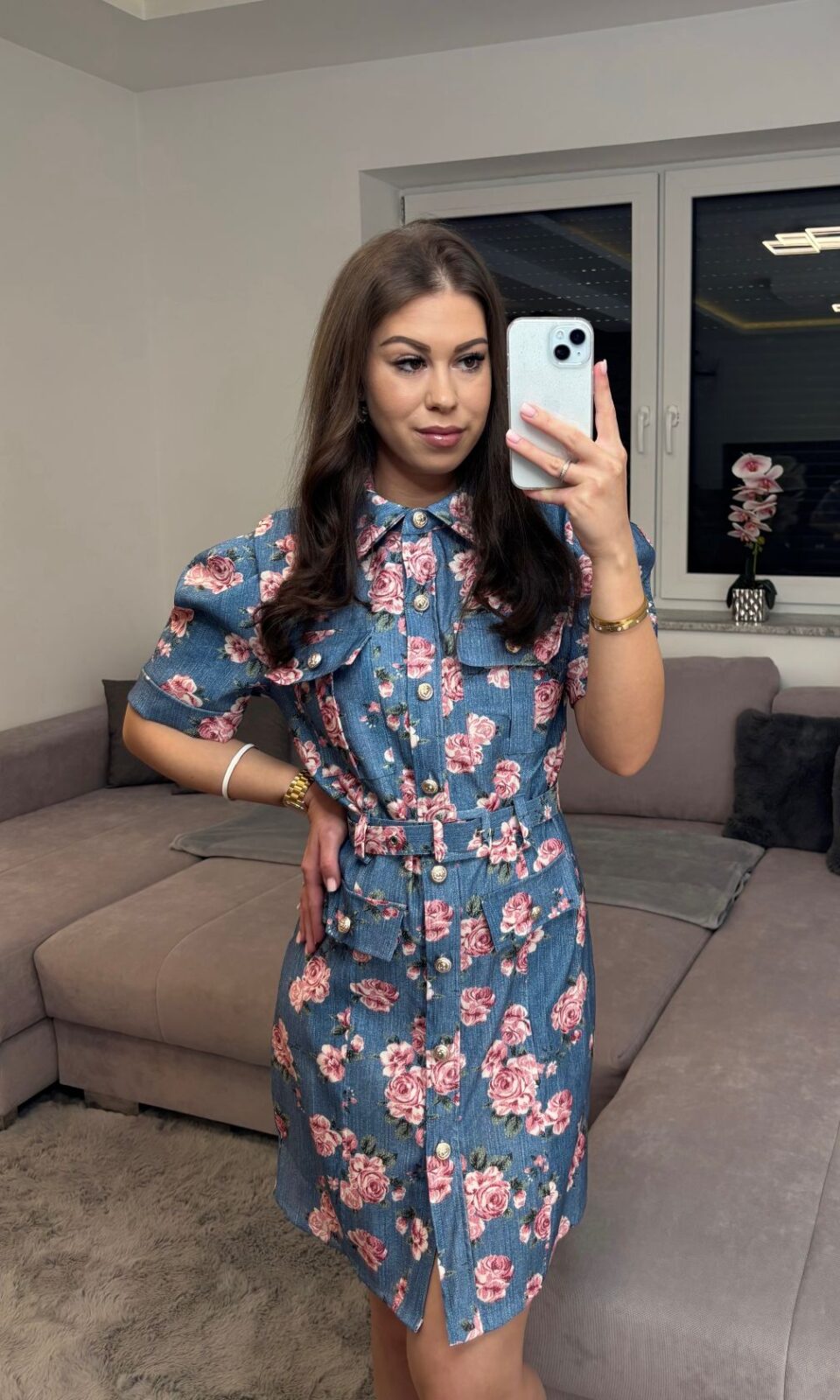 a felső része válltöméses, átlapolt, galléros, valamint anyagában hozzá illő övvel szűkíthető, az öv részén arany kiegészítők találhatóak.