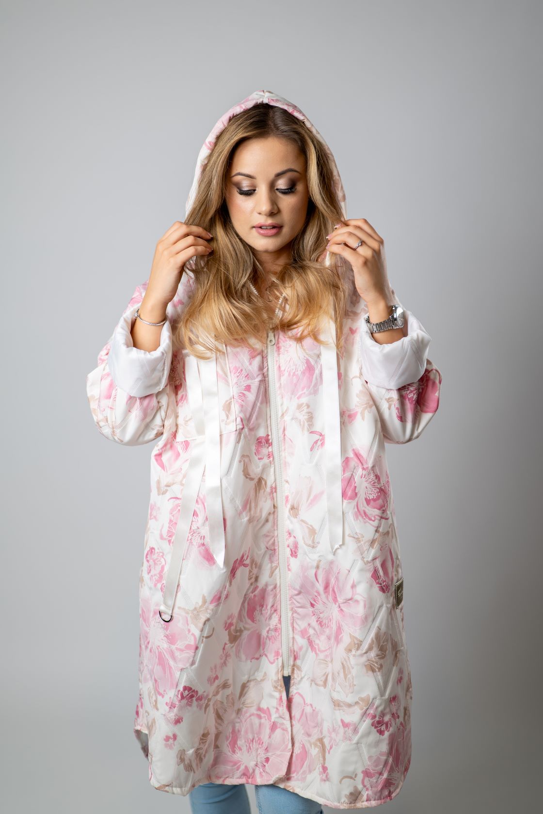 „A” vonalú túlméretezett virágmintás kabát cipzárral, kapucnival, rózsaszín virágokkal