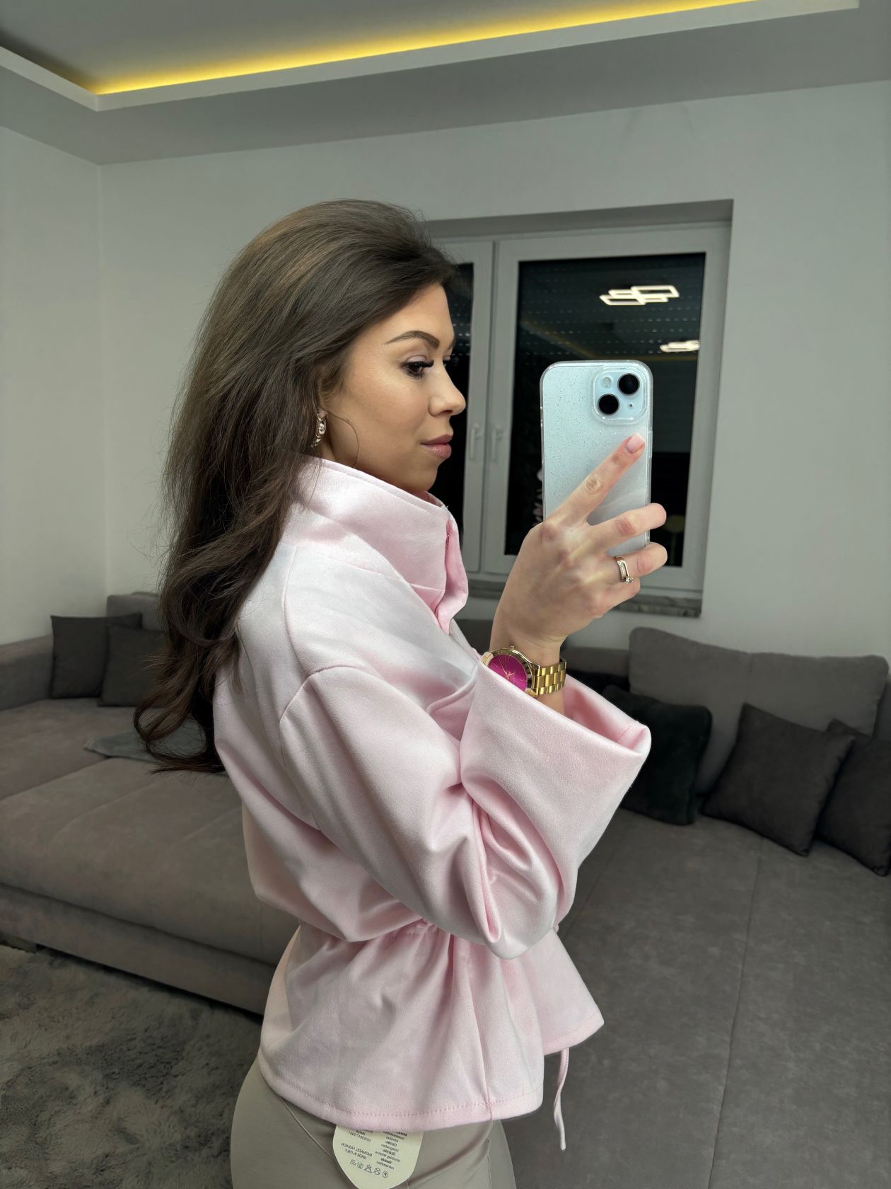 puha vékony velúr kabát babarózsaszín színben, összehúzással szűkíthető