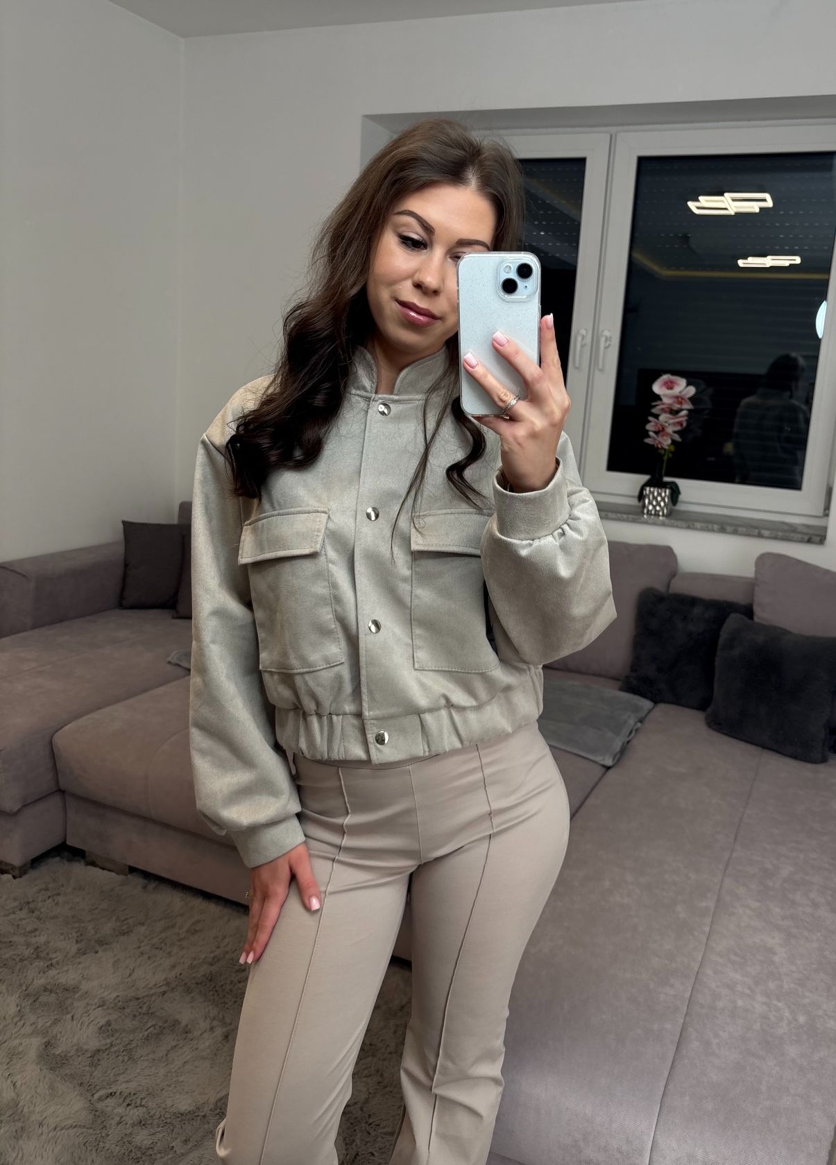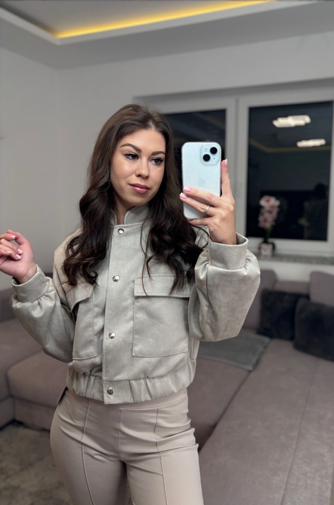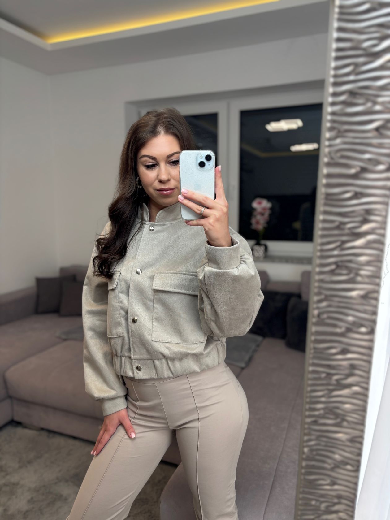 szürke, puha velúr kiskabát, gumírozott derékrésszel, bepattinthatós gombokkal